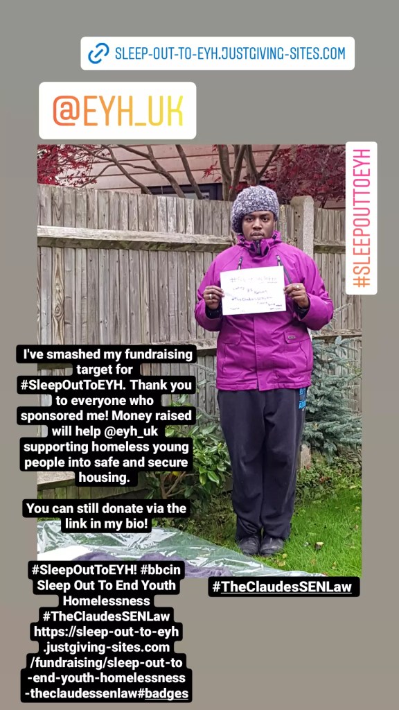 #SleepOutToEYH! #bbcin Sleep Out To End Youth Homelessness #TheClaudesSENLaw https://sleep-out-to-eyh.justgiving-sites.com/fundraising/sleep-out-to-end-youth-homelessness-theclaudessenlaw #badges